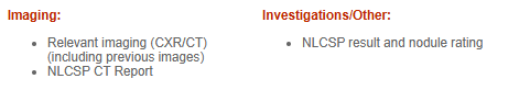 - Lung Cancer for referrals for patients with Positive National Lung Cancer Screening Program (NLCSP) result classified as high risk or very high risk as per the Nodule Management Protocol, requiring respiratory review and